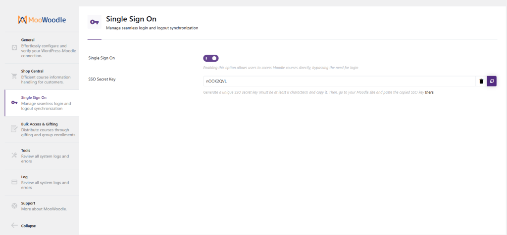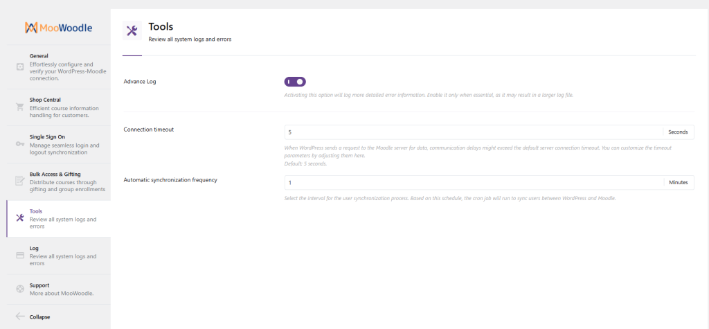 The settings tab primarily serves the purpose of linking your WordPress site with your Moodle site. To streamline this connection process, we’ve divided it into four distinct sections: