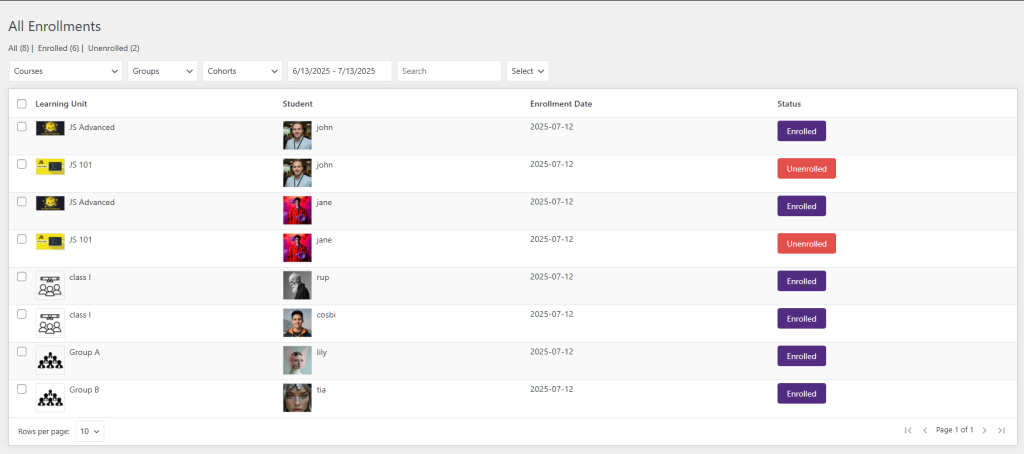 All Enrollments” option displays a list of users enrolled in your courses. On this page, you’ll find the following information about the students.
